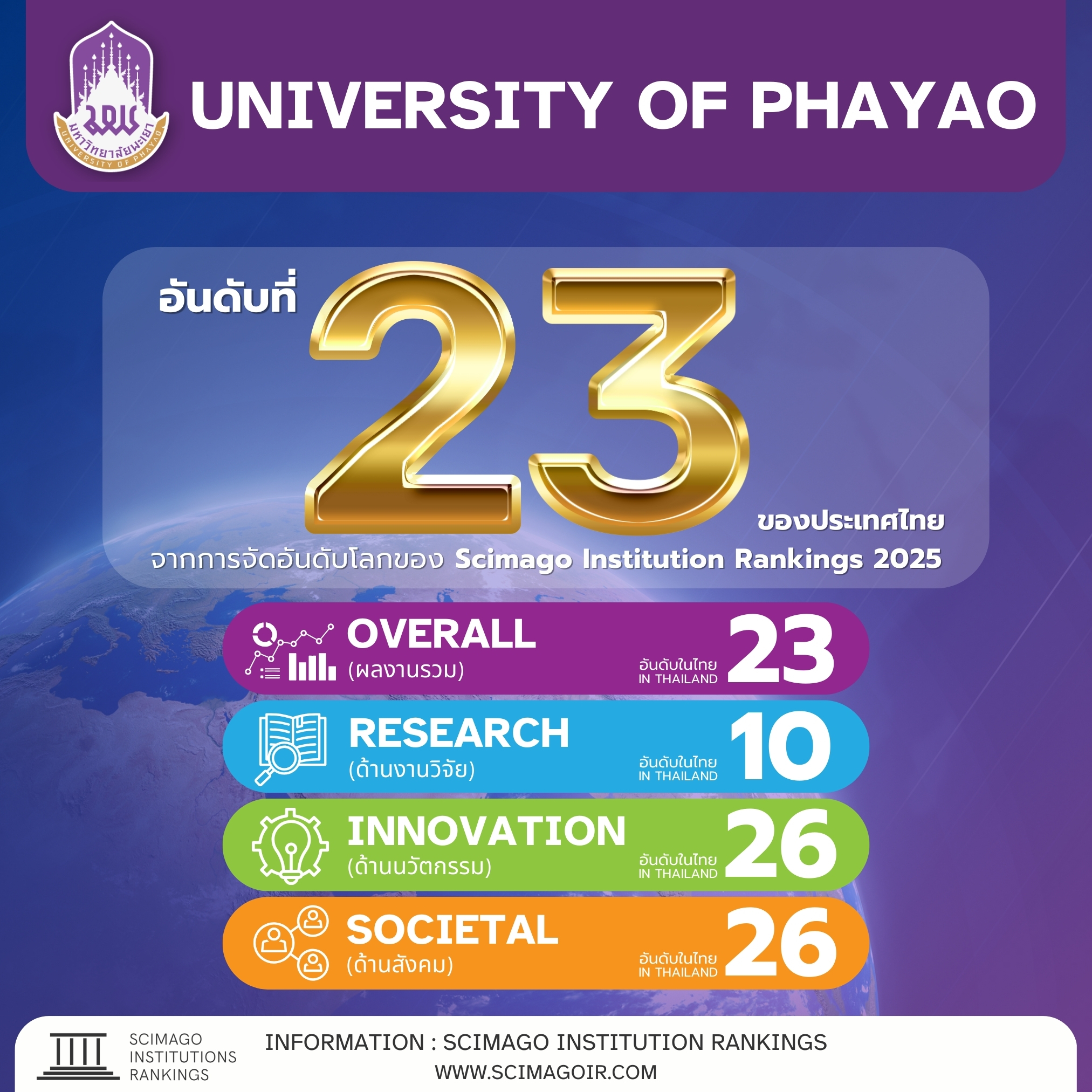 มหาวิทยาลัยพะเยา ได้รับการจัดอันดับผลงานภาพรวมอยู่ใน อันดับที่ 23 ของประเทศไทย จากผลการจัดอันดับ Scimago Institutions Rankings (SJR) ประจำปี 2025 เป็นอันดับที่ 6,639 ของโลก ซึ่งเป็นการจัดอันดับที่สะท้อนศักยภาพด้านงานวิชาการ งานวิจัย และผลกระทบต่อสังคมของสถาบันอุดมศึกษาทั่วโลก