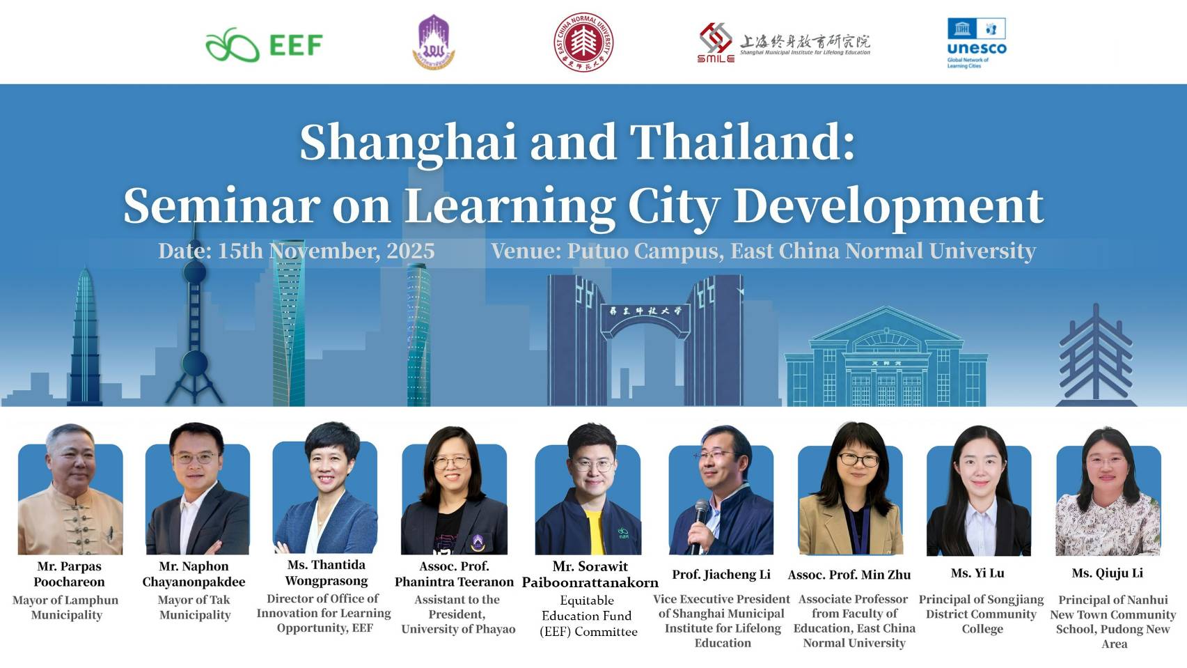 รองศาสตราจารย์ ดร.สุภกร พงศบางโพธิ์ อธิการบดีมหาวิทยาลัยพะเยา มอบหมายให้ รองศาสตราจารย์ ดร.ผณินทรา ธีรานนท์ ผู้ช่วยอธิการบดี เข้าร่วมนำเสนอบทบาทของมหาวิทยาลัยพะเยาในการขับเคลื่อนการพัฒนาเมืองแห่งการเรียนรู้ในประเทศไทย รวมถึงประสบการณ์ทำงานร่วมกับเทศบาลและชุมชนในจังหวัดพะเยา นอกจากนี้ยังได้เข้าร่วมประชุมเชิงลึกด้านความร่วมมือ การวิจัย และการจัด International Forum ร่วมกับภาคีจากจีน ในวันที่ 25 พฤศจิกายน 2568