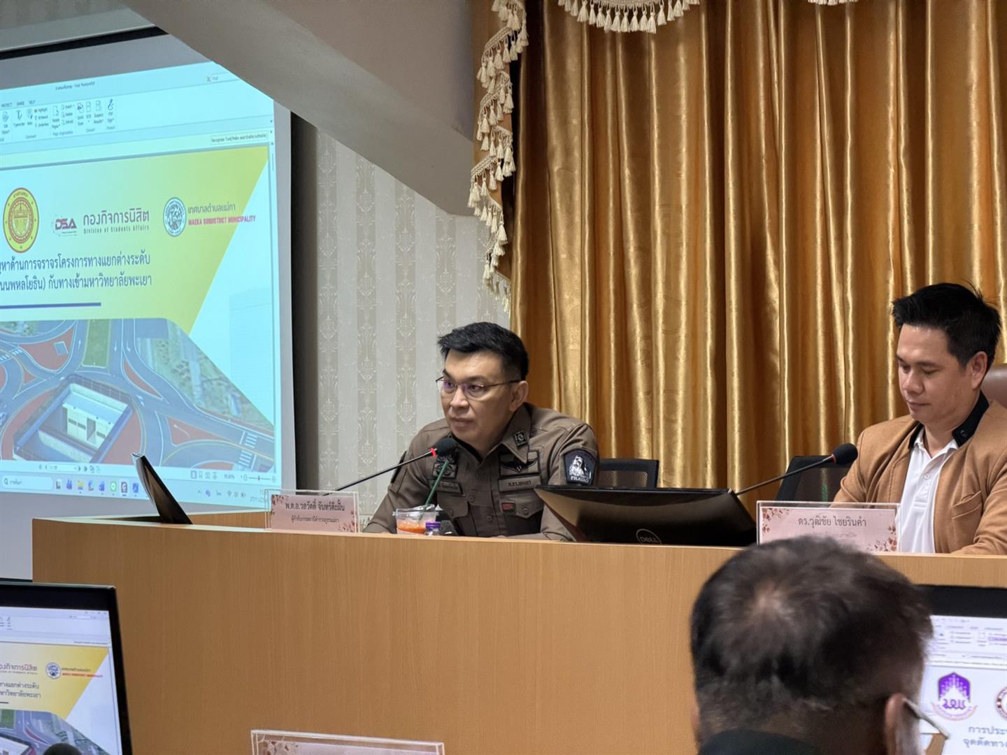 วันที่ 27 พฤศจิกายน 2568 - มหาวิทยาลัยพะเยาได้จัดประชุมสำคัญเพื่อเตรียมความพร้อมและหาแนวทางแก้ไขปัญหาการจราจรบริเวณทางเข้ามหาวิทยาลัย โดยมี ดร.วุฒิขัย ไชยรินคำ รองอธิการบดีฝ่ายคุณภาพนิสิต เป็นประธานการประชุม ร่วมกับผู้ช่วยอธิการบดี ดร.จารุวรรณ โปษยานนท์ ผู้อำนวยการสำนักงานอธิการบดี ผู้อำนวยการกองกิจการนิสิต ผู้แทนส่วนงานภายใน และผู้นำนิสิต พร้อมด้วยหน่วยงานภายนอกที่เกี่ยวข้อง ได้แก่ สถานีตำรวจภูธรแม่กา แขวงทางหลวงพะเยา เทศบาลตำบลแม่กา ผู้รับจ้าง และผู้แทนท้องที่ เพื่อหารือเกี่ยวกับโครงการก่อสร้างทางแยกต่างระดับจุดตัดทางหลวง 1 (ถนนพหลโยธิน) กับทางเข้ามหาวิทยาลัยพะเยา ตอน แม่กา - แยกประตูชัย