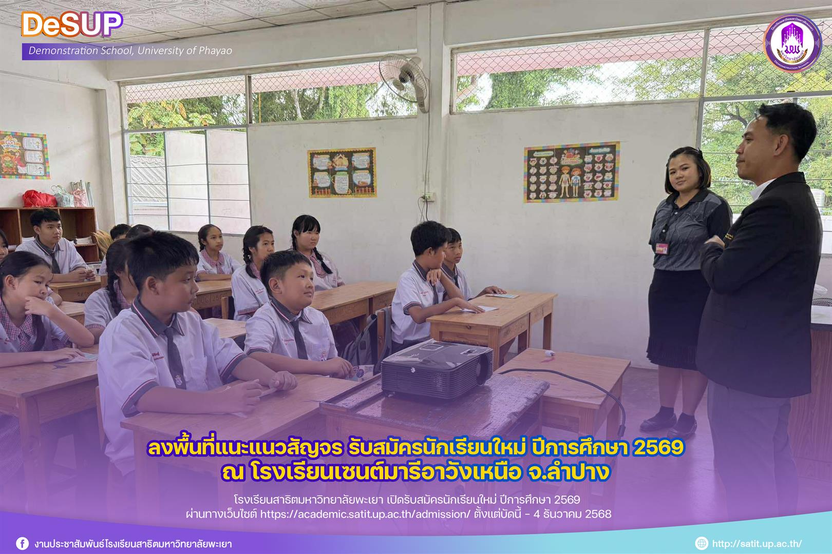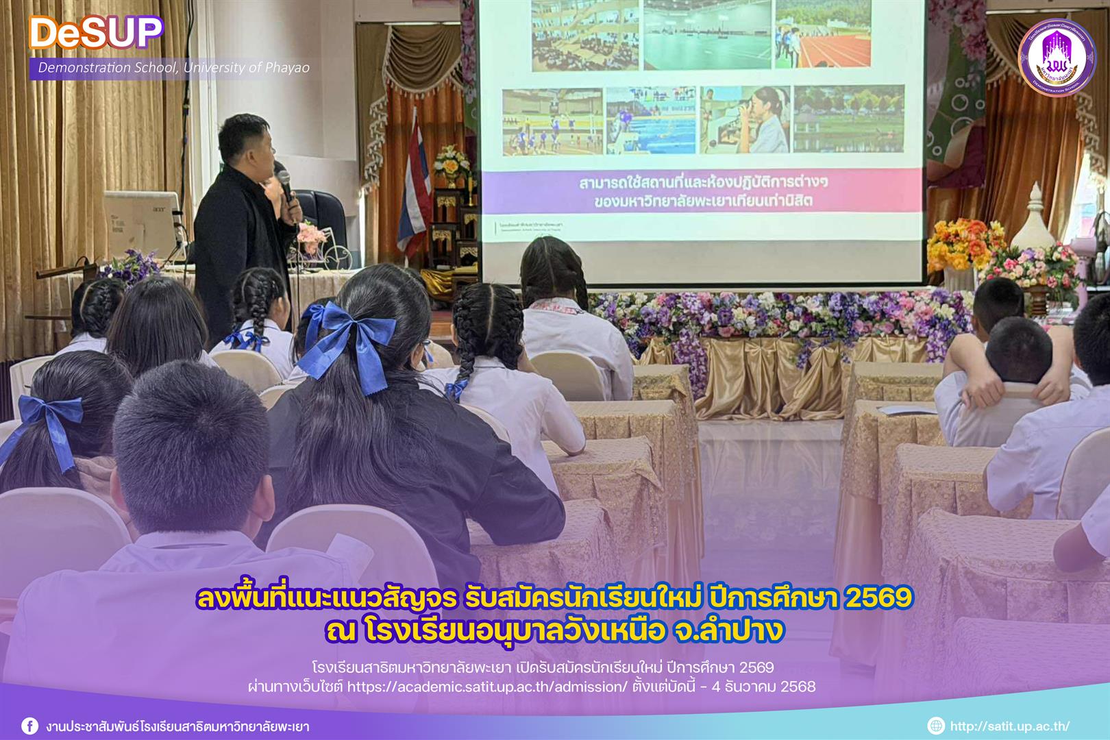 วันที่ 17 - 18 พฤศจิกายน 2568 โรงเรียนสาธิตมหาวิทาลัยพะเยา เดินทางแนะแนวสัญจร รับสมัครนักเรียนใหม่ ปีการศึกษา 2569 นำทีมโดย อาจารย์อรรถพล คณิตชรางกูร รองผู้อำนวยการฝ่ายแผนงาน อาจารย์พันธิตรา กมล ผู้ช่วยผู้อำนวยการ และ ดร.พิศาล เครือลิต อาจารย์กลุ่มสาระฯ สังคมศึกษา ลงพื้นที่จังหวัดแพร่ ณ โรงเรียนเจริญศิลป์ โรงเรียนวัดเมธังกราวาส โรงเรียนอนุบาลแพร่ และโรงเรียนมารดาอุปถัมภ์ ส่วนพื้นที่จังลำปาง นำทีมโดย ดร.คงอมร เหมรัตน์รักษ์ ผู้ช่วยผู้อำนวยการ อาจารย์วุฒิไกร ใจคำฟู อาจารย์กลุ่มสาระฯ สังคมศึกษา และ นางจินตนา ดูใจ หัวหน้างานแผนงาน ลงพื้นที่ ณ โรงเรียนอนุบาลวังเหนือ และโรงเรียนเซนต์มารีอาวังเหนือ ได้แนะแนวผ่านสื่อวีดิทัศน์และการบรรยาย อีกทั้งกิจกรรมตอบคำถามเพื่อสร้างความรู้ความเข้าใจในการเรียน กิจกรรม และความเป็นอยู่ในโรงเรียนสาธิตมหาวิทยาลัยพะเยา ก่อนมอบของที่ระลึกให้กับโรงเรียนที่ให้การต้อนรับและสนับสนุนกิจกรรมแนะแนวสัญจรในครั้งนี้เป็นอย่างดี