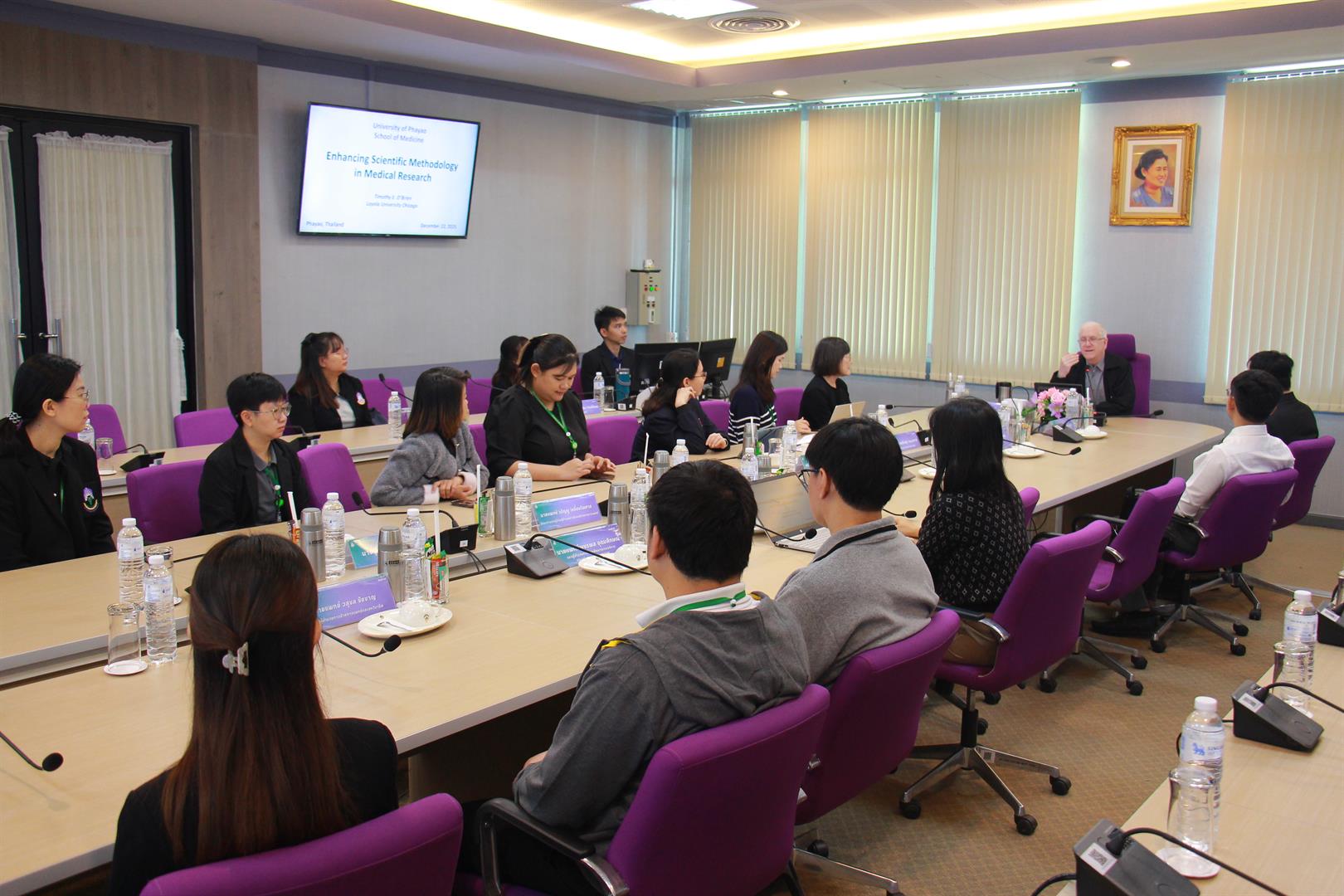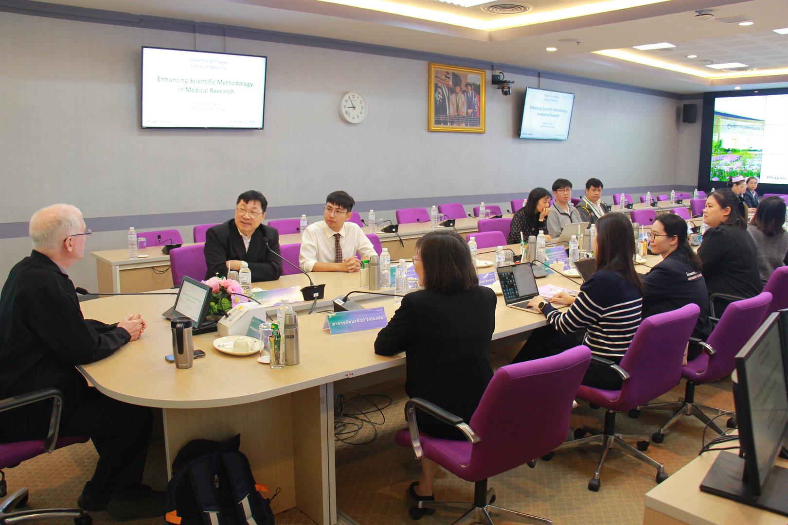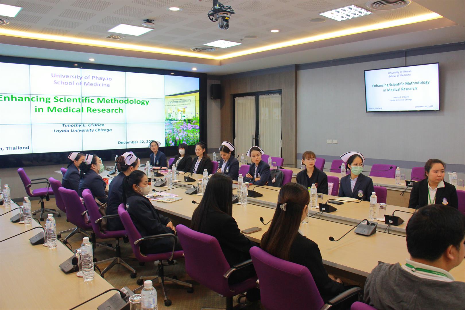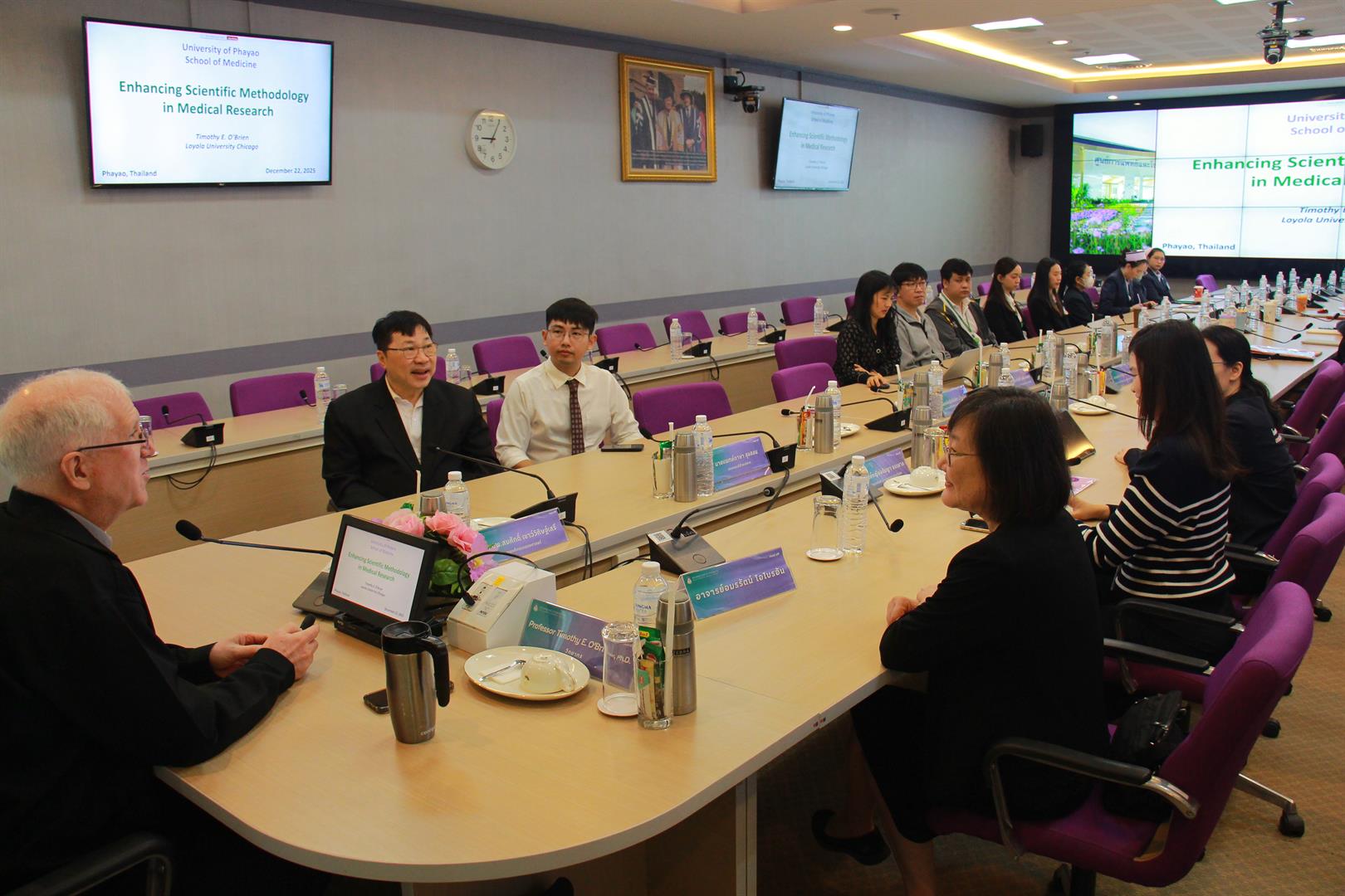 เมื่อวันที่ 22 ธันวาคม 2568 คณะแพทยศาสตร์ มหาวิทยาลัยพะเยา จัดโครงการบรรยายพิเศษ “Visiting Professor For Research” ในหัวข้อ “Enhancing Scientific Methodology in Medical Research” โดยได้รับเกียรติจากวิทยากรผู้เชี่ยวชาญระดับโลกบรรยายเพื่อพัฒนาศักยภาพด้านการวิจัยให้ก้าวสู่มาตรฐานสากล รศ.นพ.สมศักดิ์ เชาว์วิศิษฐ์เสรี คณบดีคณะแพทยศาสตร์ ให้เกียรติเป็นประธานกล่าวต้อนรับ Professor Timothy E. O'Brien, Ph.D. จาก Loyola University Chicago ประเทศสหรัฐอเมริกา ซึ่งเป็นวิทยากรในการบรรยายถ่ายทอดความรู้และประสบการณ์ให้กับผู้เข้าร่วมโครงการ ณ ห้องประชุมศาสตราจารย์พิเศษ ดร.มณฑล สงวนเสริมศรี ชั้น 2 โรงพยาบาลมหาวิทยาลัยพะเยา