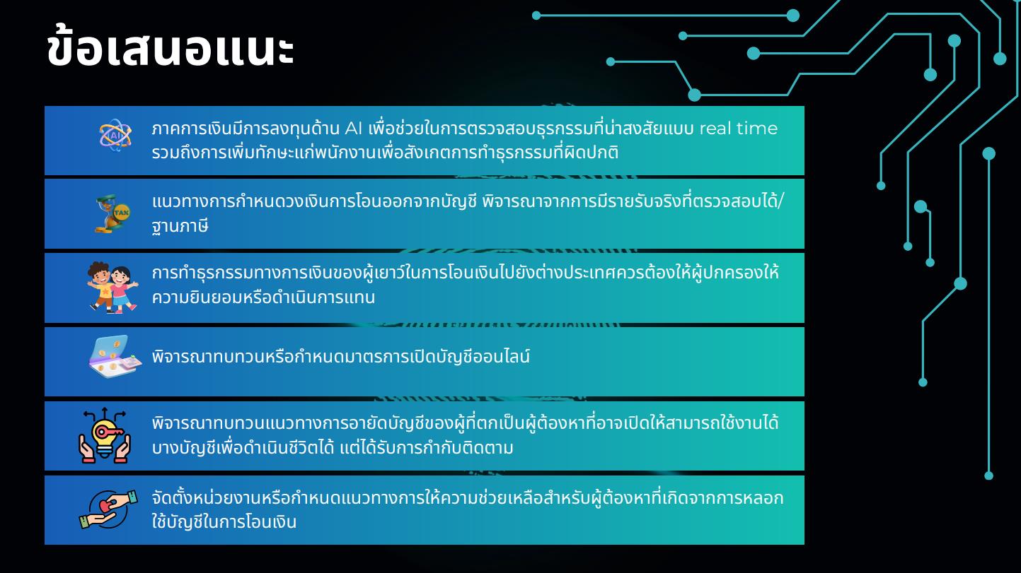 6. จัดตั้งหน่วยงานหรือกำหนดแนวทางให้ความช่วยเหลือสำหรับผู้ต้องหาที่เกิดจากการหลอก ใช้บัญชีในการโอนเงิน