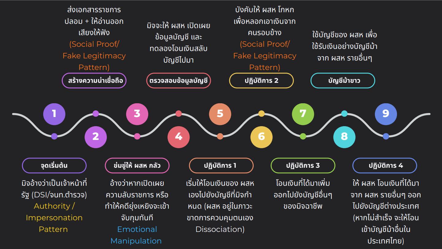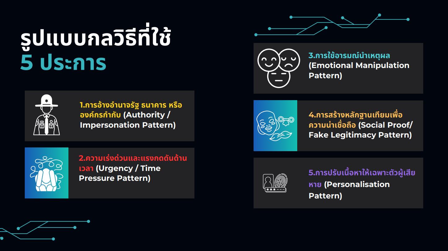 1. การอ้างอำนาจรัฐ ธนาคาร หรือองค์กรกำกับ (Authority / Impersonation Pattern) เช่น อ้างตัวเป็นตำรวจ ผู้ให้บริการโทรคมนาคม