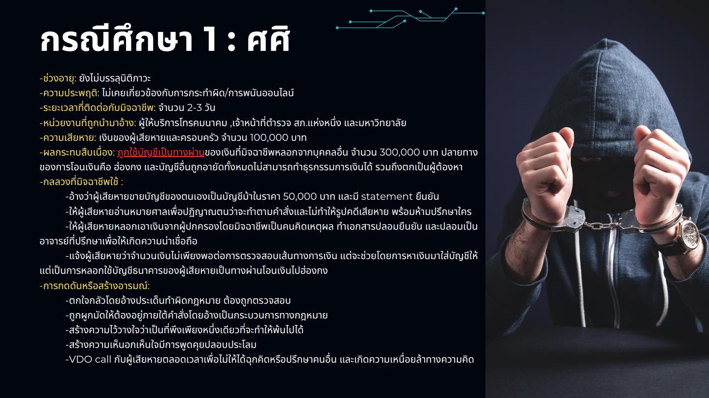จากการนำเสนองานวิจัย ในกรณีที่เกิดขึ้นล่าสุดช่วงเดือนกันยายน-พฤศจิกายน 2568 พบว่าผู้เสียหายบางรายนอกจากถูกมิจฉาชีพที่อ้างตัวเป็นเจ้าหน้าที่รัฐหลอกลวงว่าผู้เสียหายเป็นบัญชีม้าต้องมีการโอนเงินให้ตรวจสอบแล้ว ยังมีการใช้บัญชีของผู้เสียหายเป็นทางผ่านในการโอนเงินไปยังปลายทางต่างประเทศด้วย ทำให้บัญชีของผู้เสียหายกลายเป็น ‘บัญชีม้า’ ของมิจฉาชีพโดยที่ผู้เสียหายไม่รู้ตัว และมาทราบอีกครั้งเมื่อบัญชีของตนเองถูกระงับ