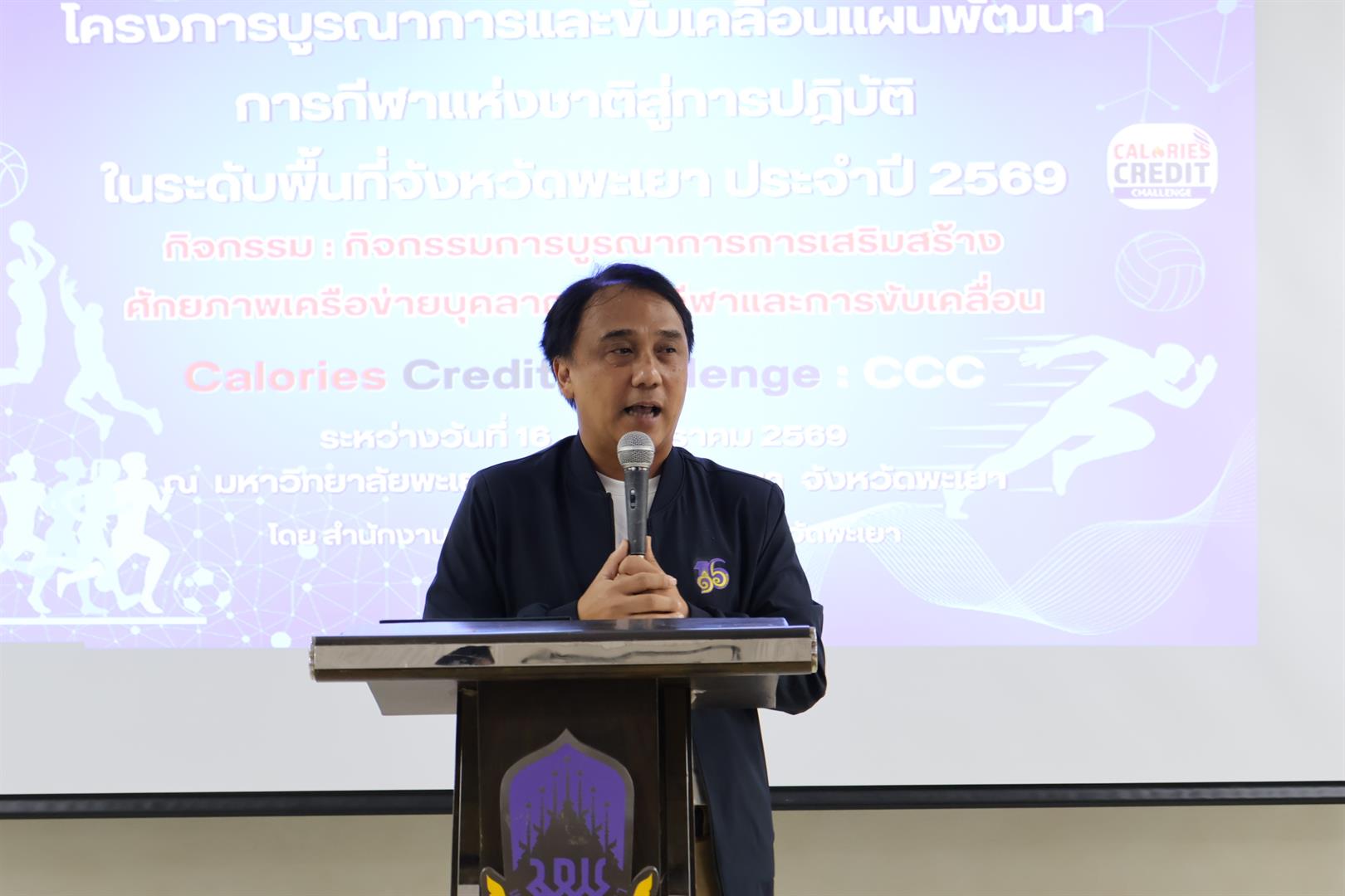 สำนักงานการท่องเที่ยวและกีฬาจังหวัดพะเยา ร่วมกับหลักสูตรวิทยาศาสตร์การออกกำลังกายและการกีฬา คณะวิทยาศาสตร์ มหาวิทยลัยพะเยา ร่วมจัดโครงการบูรณาการและขับเคลื่อนแผนพัฒนาการกีฬาแห่งชาติสู่การปฏิบัติในระดับพื้นที่ จังหวัดพะเยา ประจำปี 2569 ภายใต้กิจกรรมการบูรณาการการเสริมสร้างศักยภาพเครือข่ายบุคลากรการกีฬาและการขับเคลื่อน Calories Credit Challenge (CCC) ระหว่างวันที่ 16–17 มกราคม 2569 ณ ห้อง CE11203 มหาวิทยาลัยพะเยา อำเภอเมืองพะเยา จังหวัดพะเยา