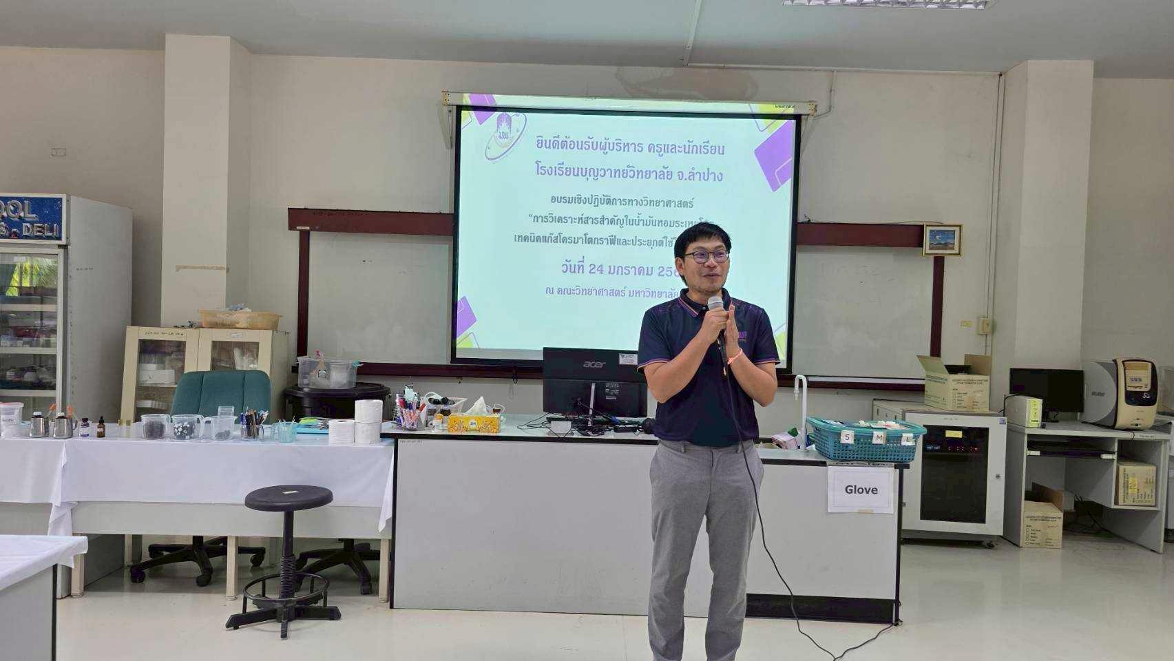 วันเสาร์ที่ 24 มกราคม 2569 คณะวิทยาศาสตร์ดำเนินกิจกรรมบริการวิชาการ โรงเรียนบุญวาทย์วิทยาลัย จังหวัดลำปาง กิจกรรมปฏิบัติการทางวิทยาศาสตร์ สำหรับนักเรียนห้องเรียนพิเศษวิทยาศาสตร์ คณิตศาสตร์ เทคโนโลยีและสิ่งแวดล้อม ระดับขั้นขั้นมัธยมศึกษาปีที่ 2/15 ประจำภาคเรียนที่ 2 ปีการศึกษา 2568 จำนวน 30 คน เข้าร่วมกิจกรรมปฏิบัติการตามความเชี่ยวชาญเฉพาะเทคโนโลยีที่เหมาะสมและนวัตกรรม “การวิเคราะห์สาระสำคัญในนำมัน หอมระเหยโดยเทคนิคแก็สโครมาโตกราฟิแมสสเปกโทรเบตรี และประยุกต์ใช้ในผลิตภัณฑ์ และ“การดูดซับสีของสารละลายด้วยวัสดุพรุน