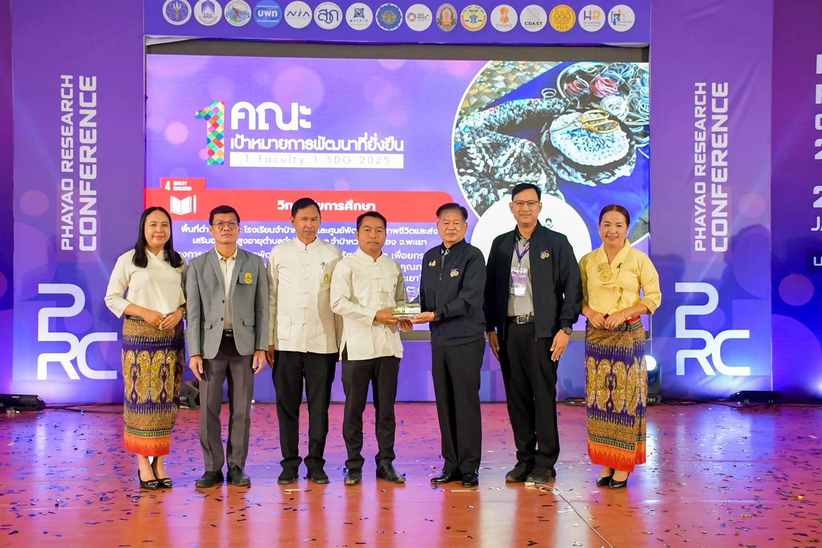 ในโอกาสนี้ วิทยาลัยการศึกษาได้รับ โล่รางวัลระดับ “Gold” จากผลการดำเนินงานโครงการ 1 คณะ 1 SDG ประจำปี 2568 จากผลงานวิจัยเรื่อง “แนวทางการพัฒนาทักษะการเรียนรู้ตลอดชีวิต เพื่อยกระดับสุขภาวะผู้สูงอายุ โดยใช้ชุมชนเป็นฐาน กรณีศึกษา : ศูนย์พัฒนาคุณภาพชีวิตและส่งเสริมอาชีพผู้สูงอายุ ตำบลจำป่าหวาย จังหวัดพะเยา” โดยมี ผู้ช่วยศาสตราจารย์ ดร.วัชระ จตุพร รองคณบดีฝ่ายวิจัยและบริการวิชาการเชิงพื้นที่ เป็นหัวหน้าโครงการ นอกจากนี้ ยังได้รับ รางวัลนักวิจัยดีเด่น มหาวิทยาลัยพะเยา ประจำปี 2567 ด้านมนุษยศาสตร์และสังคมศาสตร์ อันดับที่ 2 ได้แก่ รองศาสตราจารย์ ดร.ลือชา ลดาชาติ ประธานหลักสูตรการศึกษามหาบัณฑิต สาขาวิชาสะเต็มศึกษา
