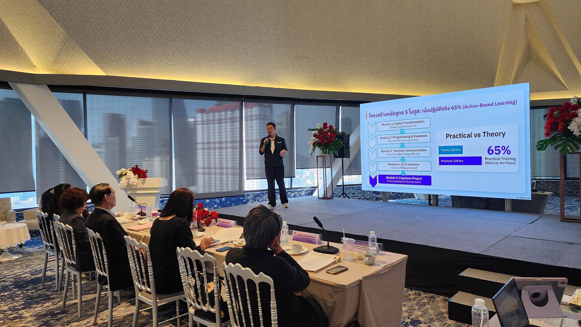 คณะวิศวกรรมศาสตร์ มหาวิทยาลัยพะเยา นำโดย ผู้ช่วยศาสตราจารย์ ดร.นัทธิ์ธนนท์ พงษ์พานิช รองคณบดีฝ่ายกิจการนิสิตและพัฒนาความร่วมมืออุตสาหกรรม เข้าร่วมนำเสนอผลงานหัวข้อ “การจัดการเพื่อเพิ่มประสิทธิภาพการผลิตจากการประยุกต์ใช้ความรู้หุ่นยนต์อุตสาหกรรมเบื้องต้น” ซึ่งเป็นต้นแบบความร่วมมือเชิงลึกในการพัฒนากำลังคนสมรรถนะสูงเพื่อรองรับอุตสาหกรรม 4.0 ภายใต้ การประกวดรางวัลต้นแบบโครงการผลิตบัณฑิตพันธุ์ใหม่ฯ (ประเภทหลักสูตร) ที่จัดโดยสำนักงานปลัดกระทรวงการอุดมศึกษา วิทยาศาสตร์ วิจัยและนวัตกรรม (อว.) เมื่อวันอังคารที่ 3 กุมภาพันธ์ 2569 ที่ผ่านมา ณ ห้อง Diamond Dome 2 ชั้น 22 โรงแรมควีนสแลนด์ กรุงเทพมหานคร