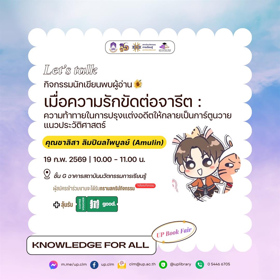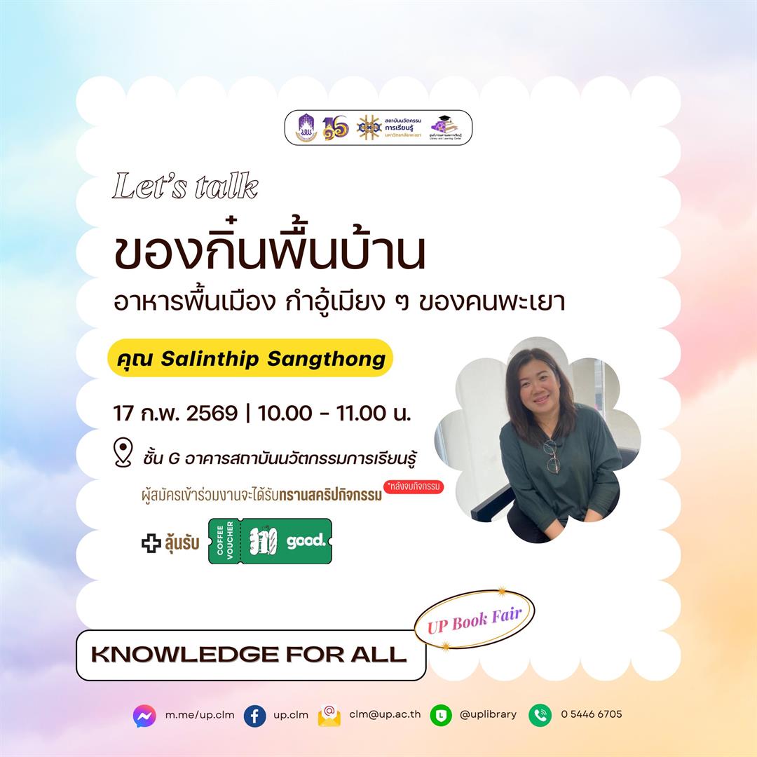 วันจันทร์ที่ 16 กุมภาพันธ์ 2569 รองศาสตราจารย์ ดร.สุภกร พงศบางโพธิ์ อธิการบดีมหาวิทยาลัยพะเยา พร้อมผู้บริหาร ร่วมเปิดงาน Knowledge for All ประจำปี 2569 (UP Book Fair ครั้งที่ 13) จัดโดยสถาบันนวัตกรรมการเรียนรู้ มหาวิทยาลัยพะเยา ในพิธีเปิดกิจกรรมในครั้งนี้ ผู้ช่วยศาสตราจารย์ ดร.น้ำเงิน จันทรมณี ผู้อำนวยการสถาบันนวัตกรรมการเรียนรู้ กล่าวรายงานถึงวัตถุประสงค์การจัดงาน และรองศาสตราจารย์ ดร.สุภกร พงศบางโพธิ์ อธิการบดีมหาวิทยาลัยพะเยา เป็นประธานกล่าวเปิดงาน โดยงานจัดขึ้นระหว่างวันที่ 16 – 20 กุมภาพันธ์ 2569 ณ ชั้น G อาคารสถาบันนวัตกรรมการเรียนรู้ มหาวิทยาลัยพะเยา