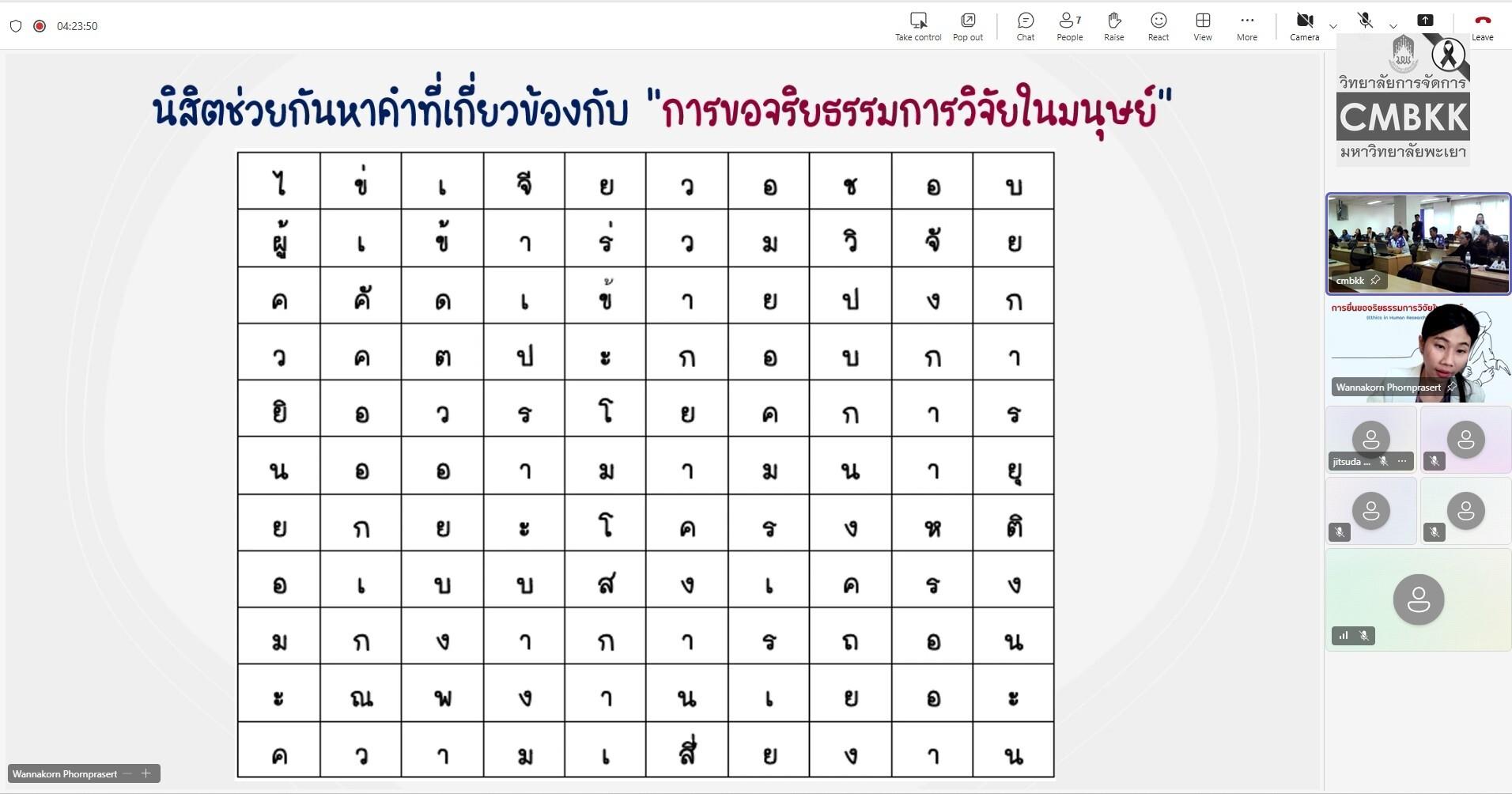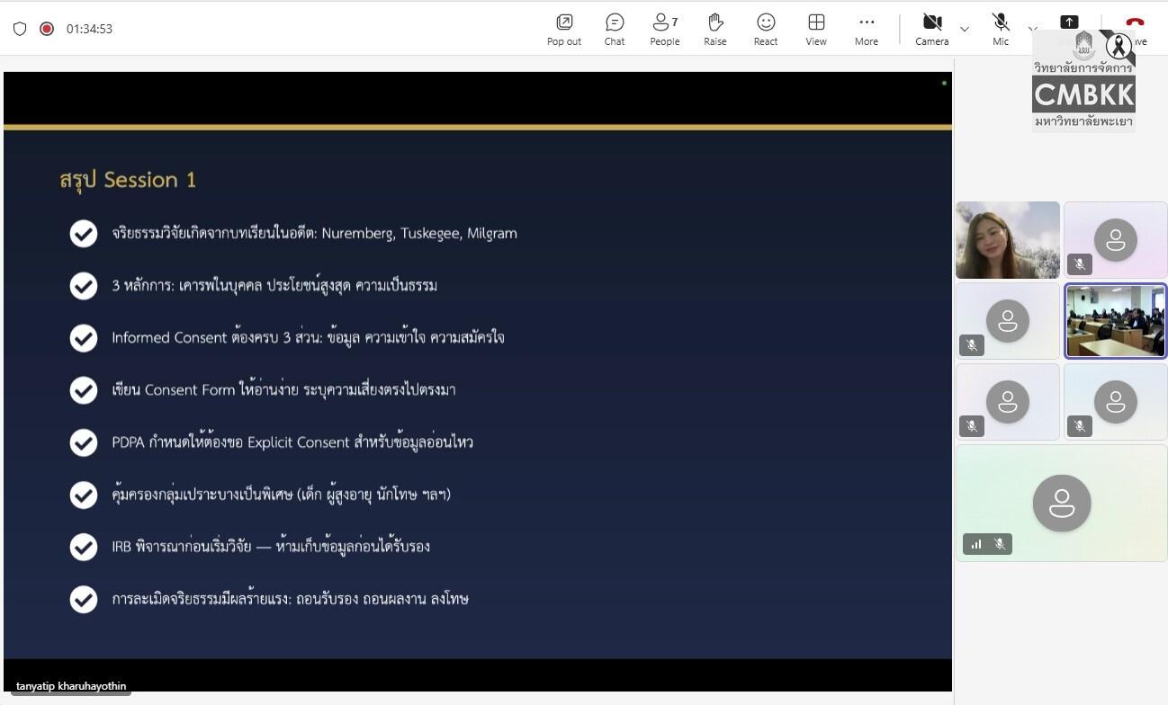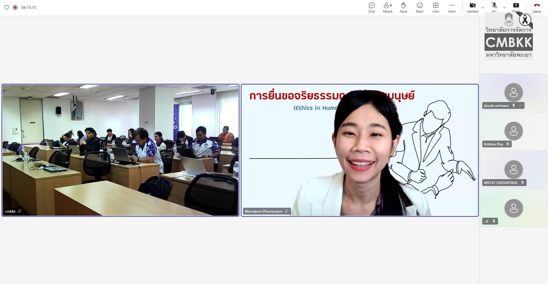 ทั้งนี้ กิจกรรมได้รับเกียรติวิทยากรจาก ผู้ช่วยศาสตราจารย์ ดร.ธัญทิพย์ คฤหโยธิน รองคณบดีฝ่ายพัฒนาความร่วมมือองค์กรและพันธกิจสากล คณะบริหารธุรกิจและนิเทศศาสตร์ มหาวิทยาลัยพะเยา และผู้ช่วยศาสตราจารย์ ดร.วรรณากร พรประเสริฐ อาจารย์สาขาวิชาวัดและประเมินผลการศึกษา วิทยาลัยการศึกษา มหาวิทยาลัยพะเยาและ กรรมการและเลขานุการในคณะกรรมการจริยธรรมการวิจัยในมนุษย์ ด้านมนุษยศาสตร์และสังคมศาสตร์ มหาวิทยาลัยพะเยา เป็นวิทยากรถ่ายทอดความรู้ “หลักจริยธรรมการวิจัยในมนุษย์และข้อกำหนดที่เกี่ยวข้อง / กระบวนการขอรับรองจริยธรรมการวิจัย” และข้อควรระวัง และ Workshop เชิงปฏิบัติการ : “การใช้งานระบบยื่นขอรับรองจริยธรรมการวิจัยในมนุษย์” ณ ห้อง R805 และผ่านสื่ออิเล็กทรอนิกส์ระบบ Microsoft Teams วิทยาลัยการจัดการ มหาวิทยาลัยพะเยา อาคารเวฟเพลส ชั้น 8 กรุงเทพมหานคร