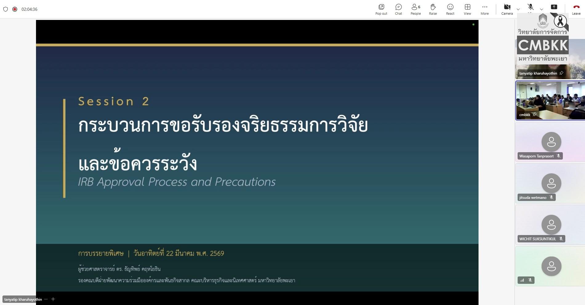 วันอาทิตย์ที่ 22 มีนาคม 2569 วิทยาลัยการจัดการ มหาวิทยาลัยพะเยา ดำเนินการจัดกิจกรรมอบรมเชิงวิชาการ หัวข้อ “การพัฒนาองค์ความรู้ด้านจริยธรรมการวิจัยในมนุษย์ สำหรับนิสิตระดับบัณฑิตศึกษา” โดยได้รับเกียรติจาก รองศาสตราจารย์ ดร.รักษิต สุทธิพงษ์ รักษาการแทนคณบดีวิทยาลัยการจัดการ เป็นประธานกล่าวเปิดกิจกรรมดังกล่าวฯ พร้อมด้วย ผู้ช่วยศาสตราจารย์ ดร.ศิริพร แพรศรี รักษาการแทนรองคณบดีวิทยาลัยการจัดการ คณาจารย์ บุคลากร และนิสิต เข้าร่วมกิจกรรมอย่างพร้อมเพรียง การจัดกิจกรรมในครั้งนี้มีวัตถุประสงค์เพื่อให้นิสิตระดับบัณฑิตศึกษาได้รับความรู้ ความเข้าใจเกี่ยวกับหลักจริยธรรมการวิจัยในมนุษย์และข้อกำหนดที่เกี่ยวข้อง ตระหนักถึงความสำคัญของการคุ้มครองสิทธิและสวัสดิภาพของผู้เข้าร่วมวิจัย สามารถดำเนินการวิจัยได้อย่างถูกต้องตามมาตรฐานจริยธรรม รวมทั้งมีทักษะในการจัดเตรียมเอกสารและยื่นขอรับรองจริยธรรมการวิจัยในมนุษย์อย่างเป็นระบบและมีประสิทธิภาพ