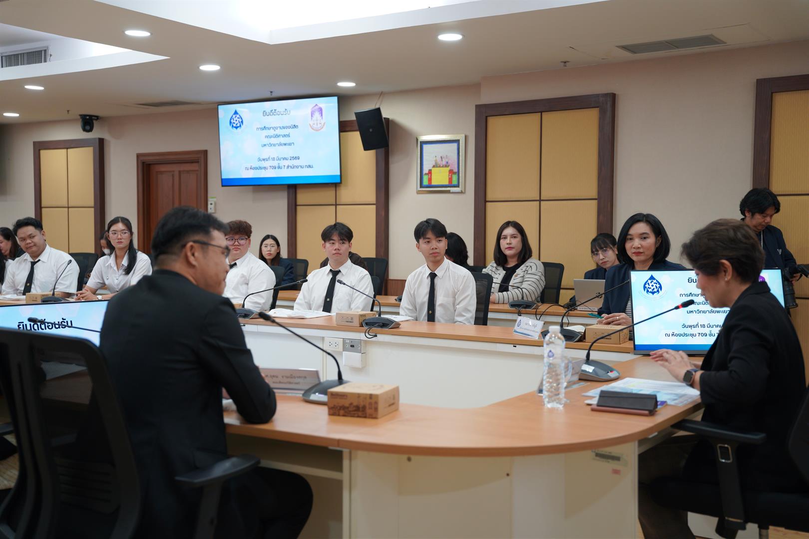 วันที่ 18 มีนาคม 2569 บุคลากรคณะนิติศาสตร์พร้อมด้วยสโมสรนิสิตคณะนิติศาสตร์ มหาวิทยาลัยพะเยา เข้าศึกษาดูงาน ณ ห้องประชุม 709 สำนักงานคณะกรรมการสิทธิมนุษยชนแห่งชาติ โดยมีนางสาวหรรษา หอมหวล เลขาธิการคณะกรรมการสิทธิมนุษยชนแห่งชาติและเจ้าหน้าที่ ให้การต้อนรับ และบรรยายให้ความรู้ในหัวข้อ “บทบาทหน้าที่ของสำนักงานคณะกรรมการสิทธิมนุษยชนแห่งชาติ”
