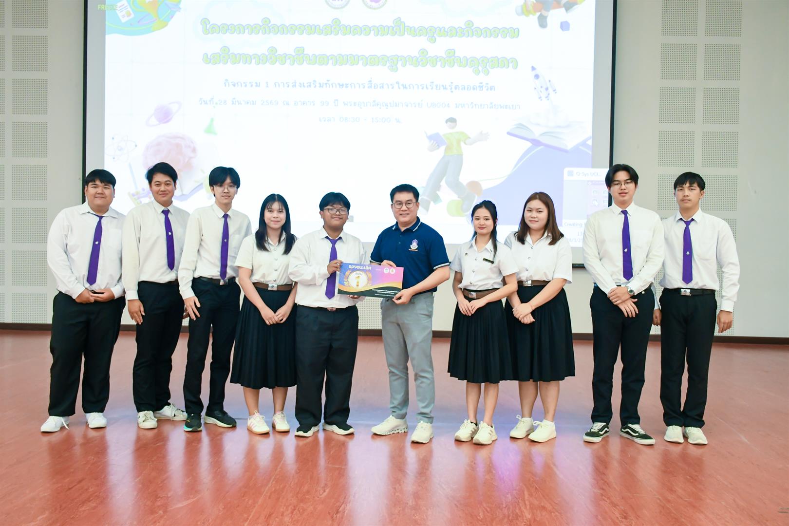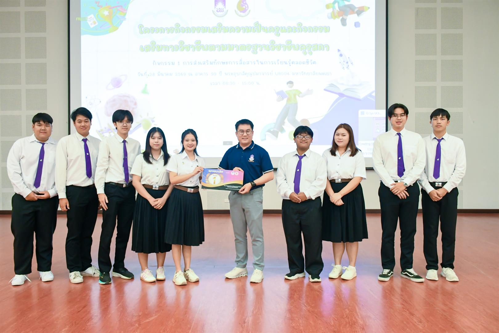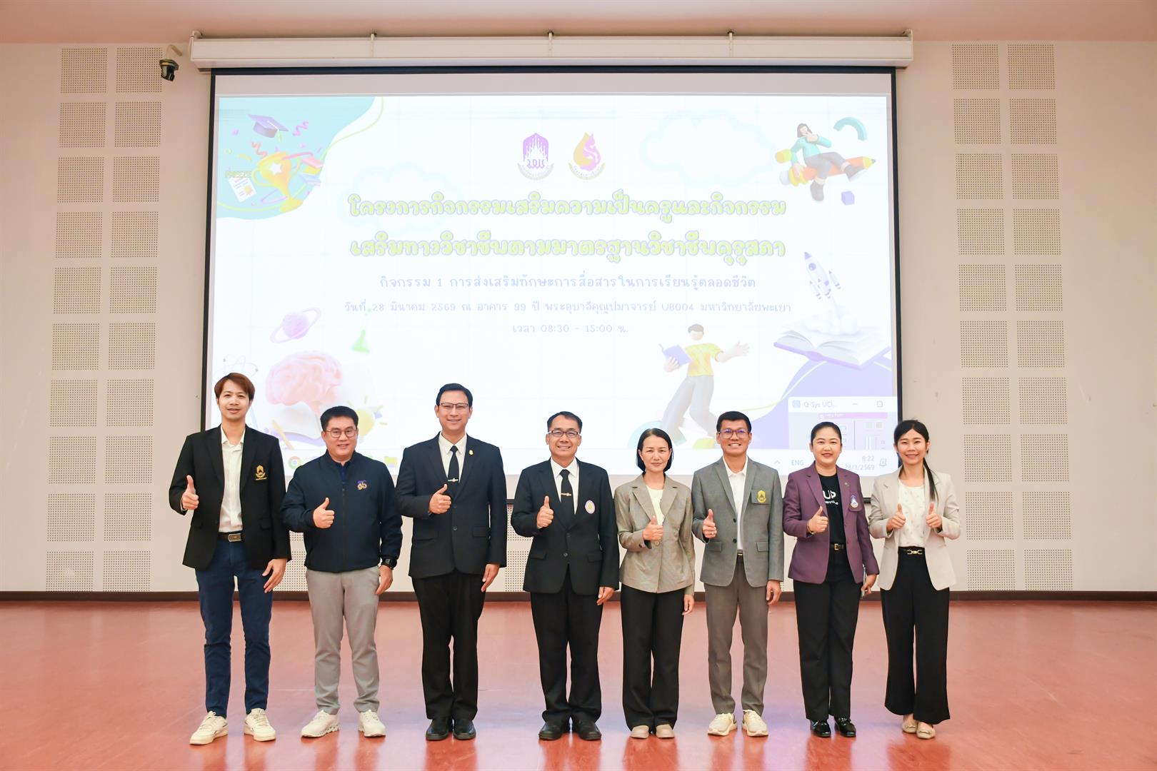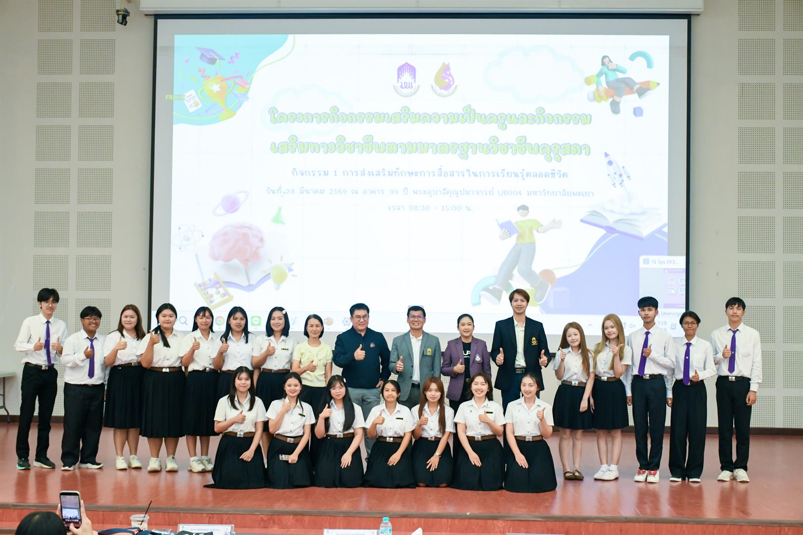 วันที่ 28 มีนาคม 2569 เวลา 08.30 น. วิทยาลัยการศึกษา ดำเนินโครงการกิจกรรมเสริมความเป็นครูและกิจกรรมเสริมทางวิชาชีพตามมาตรฐานวิชาชีพคุรุสภา กิจกรรม 1 การส่งเสริมทักษะการสื่อสารในการเรียนรู้ตลอดชีวิต ณ UB004 อาคาร 99 ปี พระอุบาลีคุณูปมาจารย์ มหาวิทยาลัยพะเยา โดยมี รองศาสตราจารย์ ดร.รักษิต สุทธิพงษ์ คณบดีวิทยาลัยการศึกษา เป็นประธานกล่าวเปิดโครงการฯ พร้อมด้วย ผู้ช่วยศาสตราจารย์ ดร.ณัฐวุฒิ สัพโส อาจารย์เมทิกา เลิศปฐมา ผู้ช่วยคณบดี ผู้ช่วยศาสตราจารย์ ดร.วรรณากร พรประเสริฐ อาจารย์สาขาวิชาวัดและประเมินผลการศึกษา หัวหน้างาน บุคลากรสายสนับสนุน ตลอดจนสโมสรนิสิต และนิสิตชั้นปีที่ 1 วิทยาลัยการศึกษา เข้าร่วมกิจกรรมอย่างพร้อมเพรียง ภายในกิจกรรมได้รับเกียรติจาก ดร.อภิวัฒน์ กันศรีเวียง ศึกษาธิการจังหวัดพะเยา เป็นวิทยากรบรรยายพิเศษในหัวข้อ “พิมพ์เขียวครูแห่งอนาคต : การประยุกต์ใช้สื่อและเทคโนโลยีทางการศึกษา เพื่อเสริมสร้างศักยภาพครูมืออาชีพในบริบทการเรียนรู้ตลอดชีวิต” ซึ่งเป็นประเด็นสำคัญในการพัฒนาศักยภาพนิสิตให้สอดคล้องกับการเปลี่ยนแปลงของโลกยุคดิจิทัล จากนั้นเป็นกิจกรรมการแข่งขันประกวดสื่อการเรียนการสอนของนิสิตชั้นปีที่ 1 โดยมีวัตถุประสงค์เพื่อให้นิสิตมีความรู้ความเข้าใจเกี่ยวกับสื่อ นวัตกรรม และเทคโนโลยีทางการศึกษา ตลอดจนเสริมสร้างทักษะในการออกแบบ ผลิต และประยุกต์ใช้สื่อการสอนอย่างมีประสิทธิภาพ อีกทั้งยังเป็นเวทีในการแลกเปลี่ยนเรียนรู้ระหว่างนิสิต คณาจารย์ และผู้เชี่ยวชาญ ภายใต้คำขวัญ “แกร่งกล้าวิชาการ เชี่ยวชาญวิชาชีพครู ชำนาญการสร้างสื่อนวัตกรรม” ทั้งนี้ กิจกรรมได้รับเกียรติจากคณะกรรมการผู้ทรงคุณวุฒิ ได้แก่ ดร.วัชรินทร์ แก่นจันทร์ ดร.อธิพงษ์ เพ็ชรเกิด และอาจารย์จินตนา แปบดิบ อาจารย์สาขาวิชาภาษาไทย คณะศิลปศาสตร์ มหาวิทยาลัยพะเยา ร่วมตัดสินการประกวดและให้ข้อเสนอแนะเชิงวิชาการ อันเป็นประโยชน์ต่อการพัฒนาอัตลักษณ์นิสิตวิทยาลัยการศึกษาให้มีความพร้อมในวิชาชีพครูต่อไป สอดคล้องกับเป้าหมายการพัฒนาที่ยั่งยืน (Sustainable Development Goals) SDG 4: ส่งเสริมโอกาสในการเรียนรู้ สร้างการศึกษาที่มีคุณภาพและเท่าเทียม (Quality Education) SDG 9: ส่งเสริมอุตสาหกรรม นวัตกรรม และโครงสร้างพื้นฐานที่ยั่งยืน และSDG 17 : สร้างความร่วมมือเพื่อการพัฒนาที่ยั่งยืน (Partnerships for the Goals)