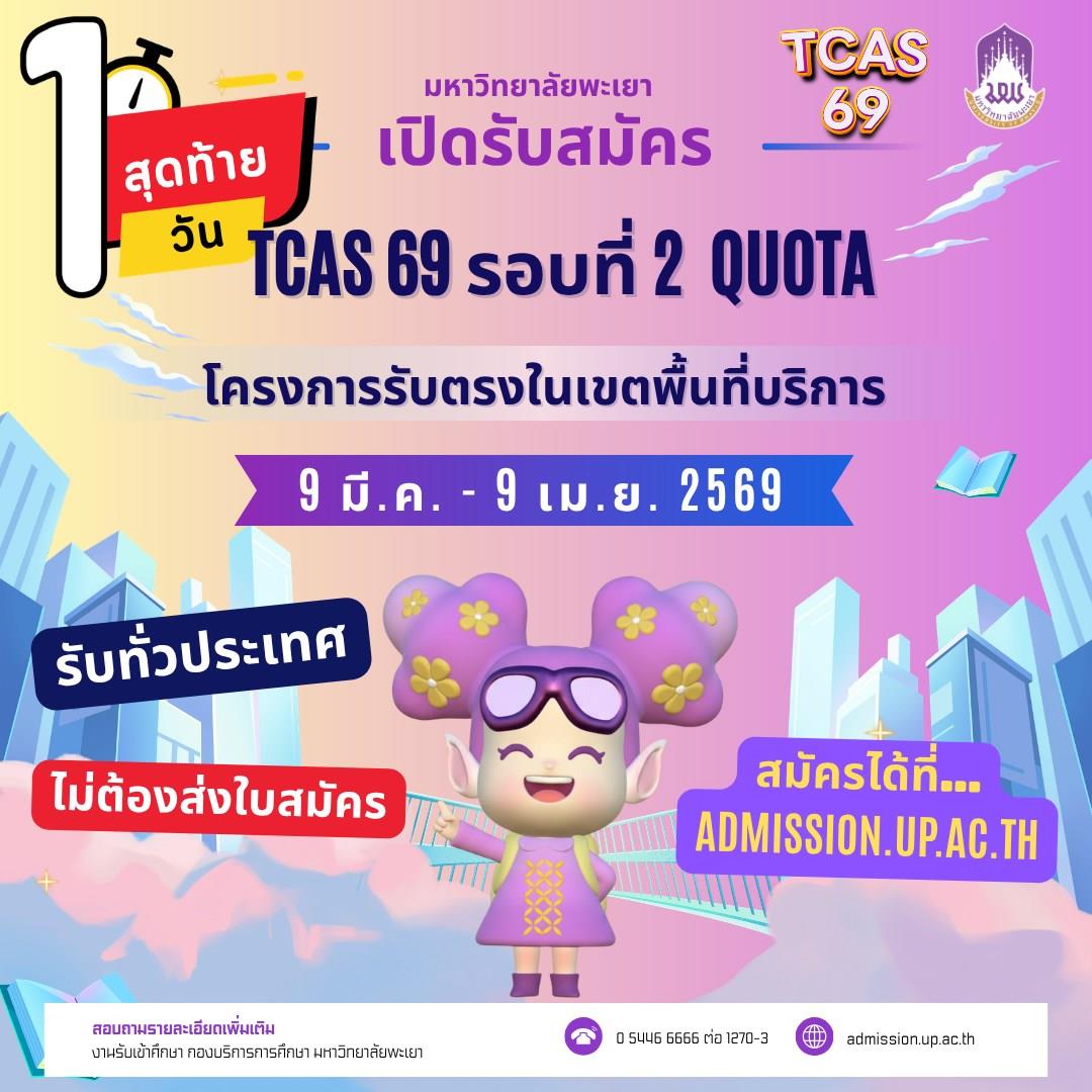 📣 มหาวิทยาลัยพะเยา ประกาศโค้งสุดท้าย สำหรับการสมัครเข้าศึกษาระดับปริญญาตรี ผ่านระบบ TCAS รอบที่ 2 โครงการรับตรงในเขตพื้นที่บริการ ประจำปีการศึกษา 2569 ซึ่งจะปิดรับสมัครในวันนี้ (9 เมษายน 2569) เท่านั้น