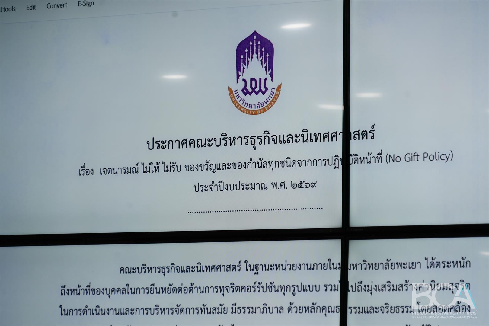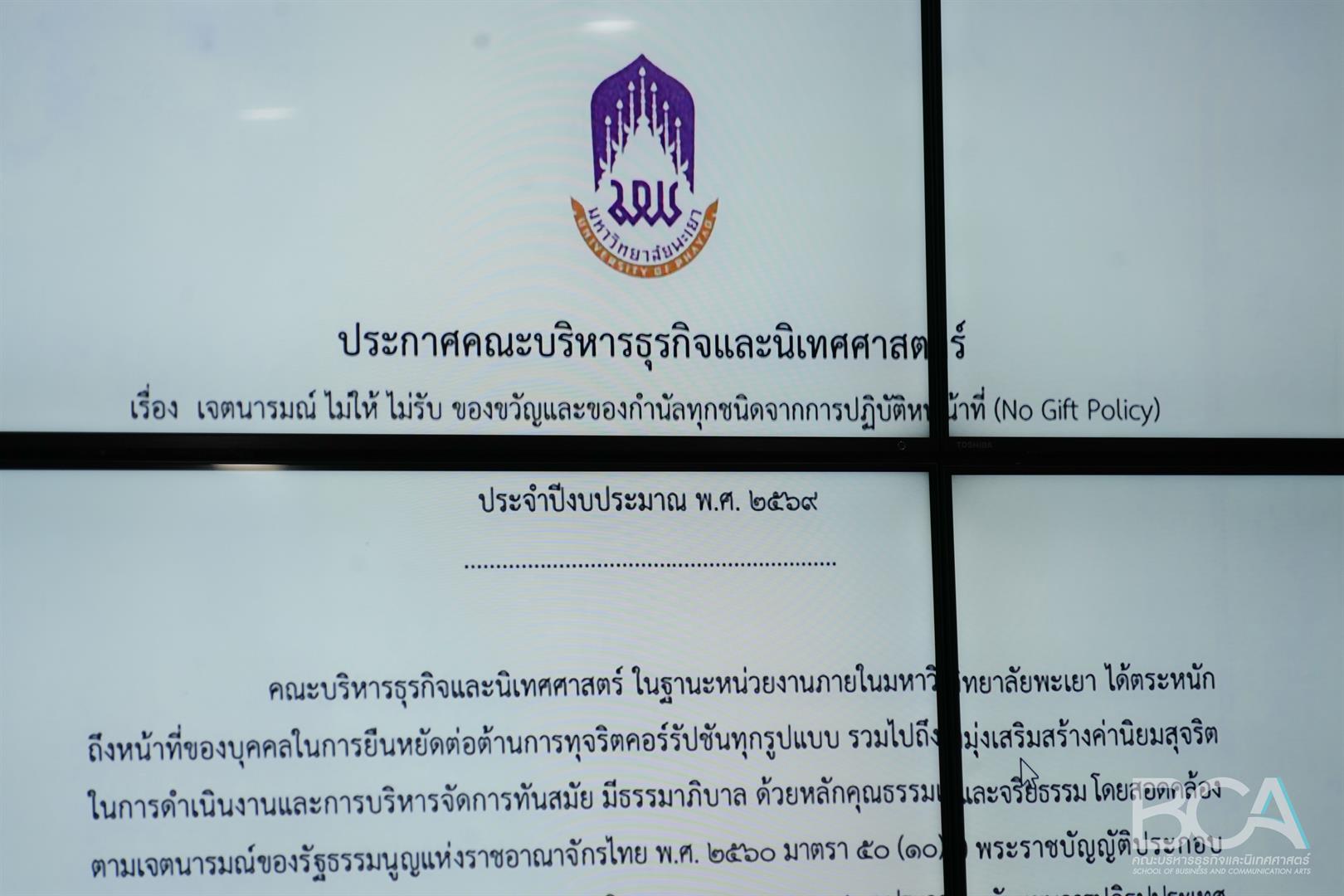 ในการนี้ คณบดีได้เน้นย้ำว่า คณะบริหารธุรกิจและนิเทศศาสตร์เป็นหน่วยงานที่ผู้บริหารและบุคลากรของคณะฯ ทุกคน ไม่ให้ ไม่รับ ของขวัญและของกำนัลทุกชนิดจากการปฏิบัติหน้าที่ (No Gift Policy) ทั้งในขณะ ก่อน หรือหลังการปฏิบัติหน้าที่ อันอาจส่งผลให้เกิดการทุจริตและประพฤติมิชอบ ในทุกเทศกาลหรือโอกาสอื่นใด รวมถึงไม่ร่วมมือหรือสนับสนุนการทุจริตและประพฤติมิชอบทุกรูปแบบ พร้อมทั้งประพฤติตนโดยยึดถือมาตรฐานทางจริยธรรมของบุคลากรและประมวลจริยธรรมมหาวิทยาลัยพะเยา
