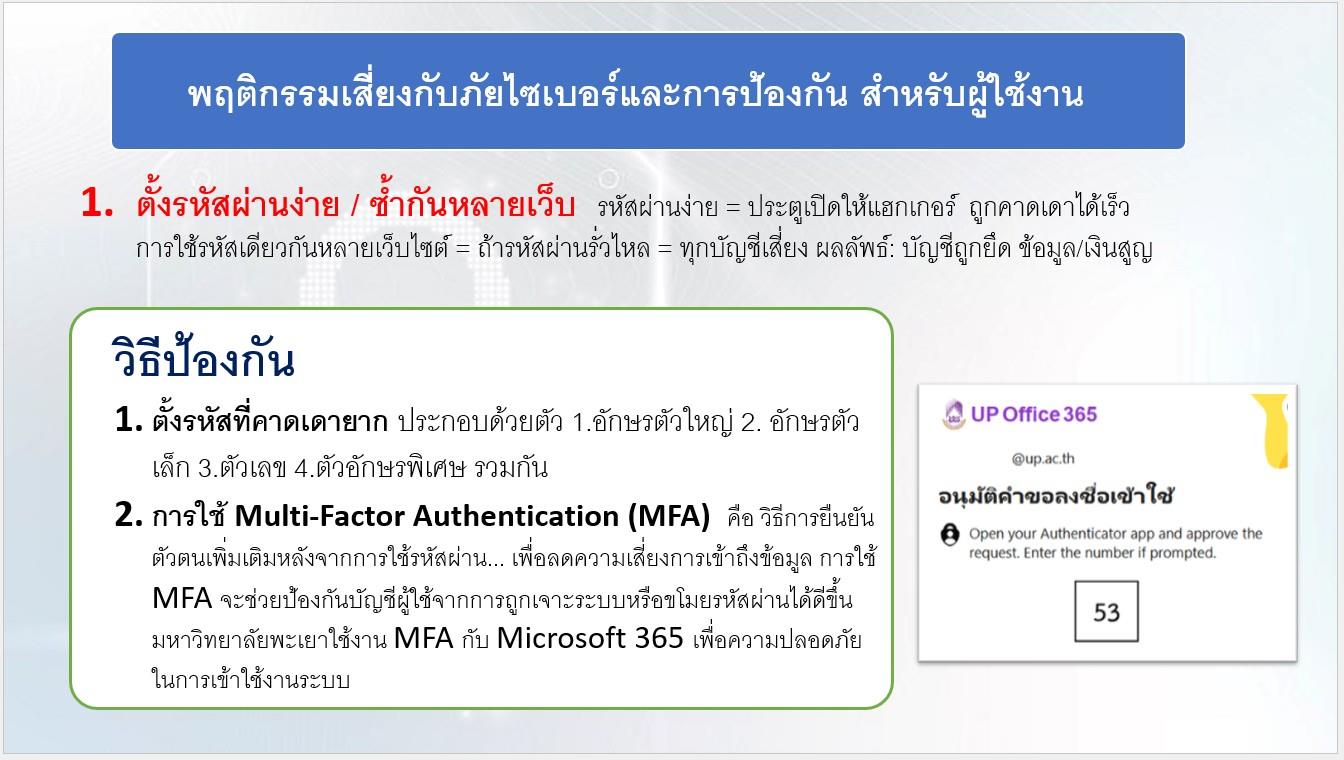 On Tuesday, September 16, 2025, the School of Liberal Arts, University of Phayao organized a workplace environment and safety development program titled “Safe Practices in Cyber Systems Use.” The event took place in Meeting Room CE14203 at the School of Liberal Arts, aiming to raise awareness among participants about cyber threats and how to safely navigate digital systems.