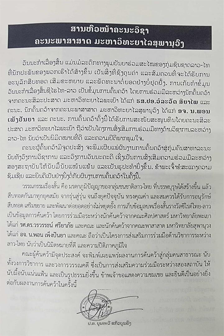 The research project was led by Assoc. Prof. Dr. Warawat Sriyabhaya, with co-researchers Asst. Prof. Pattra Akeprasert, Asst. Prof. Dr. Parichat Pothii, and Dr. Nalinpat Mekkriengkrai, together with researchers from the Faculty of Humanities, Souphanouvong University, Mr. Phon Phengphanya, Mr. Singthong Phueangphim, and Ms. Sudavanh Phimmachan.