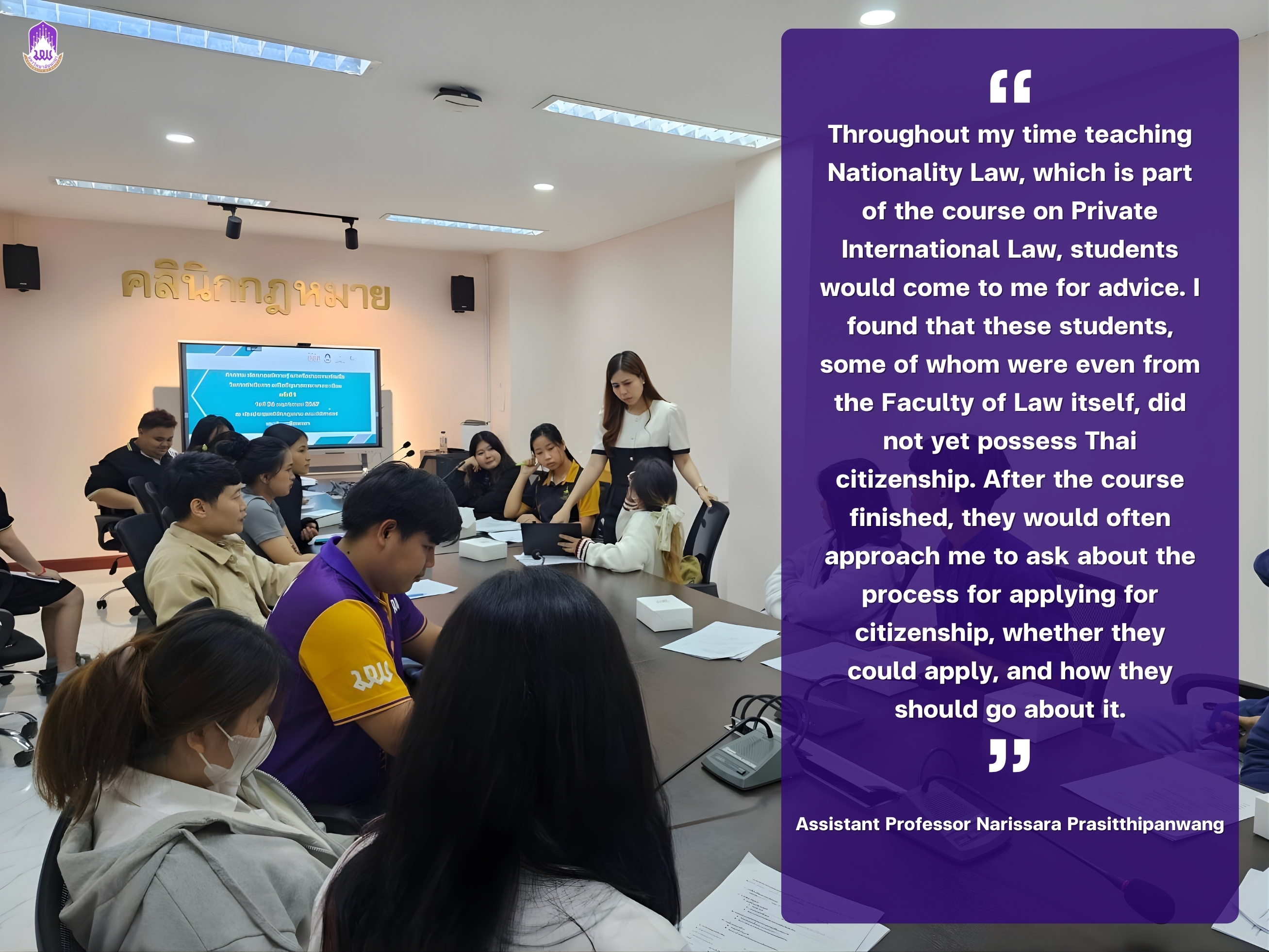 "Throughout my time teaching Nationality Law, which is part of the course on Private International Law, students would come to me for advice. I found that these students, some of whom were even from the Faculty of Law itself, did not yet possess Thai citizenship. After the course finished, they would often approach me to ask about the process for applying for citizenship, whether they could apply, and how they should go about it," she explains.