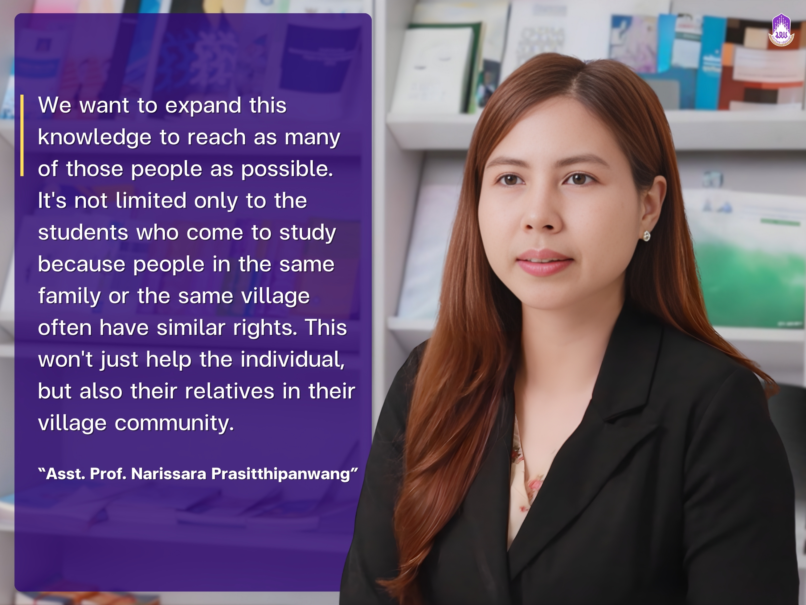 "We want to expand this knowledge to reach as many of those people as possible. It's not limited only to the students who come to study because people in the same family or the same village often have similar rights. This won't just help the individual, but also their relatives in their village community," says Asst. Prof. Narissara Prasitthipanwang.