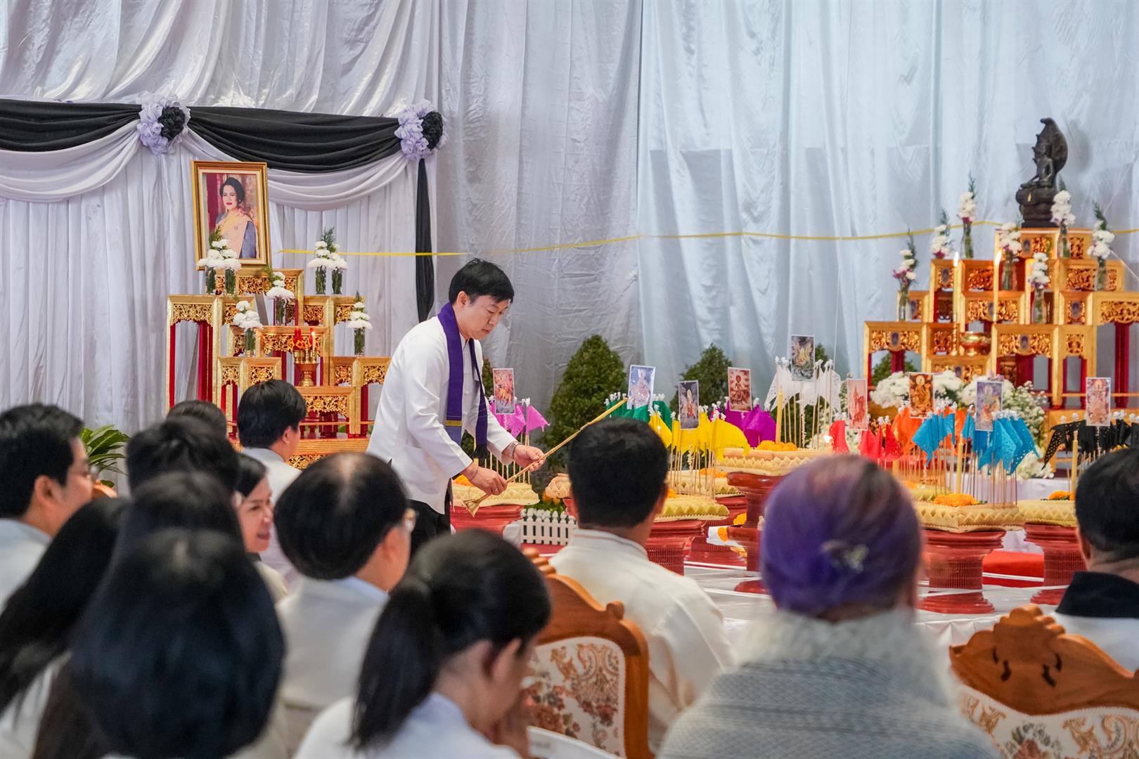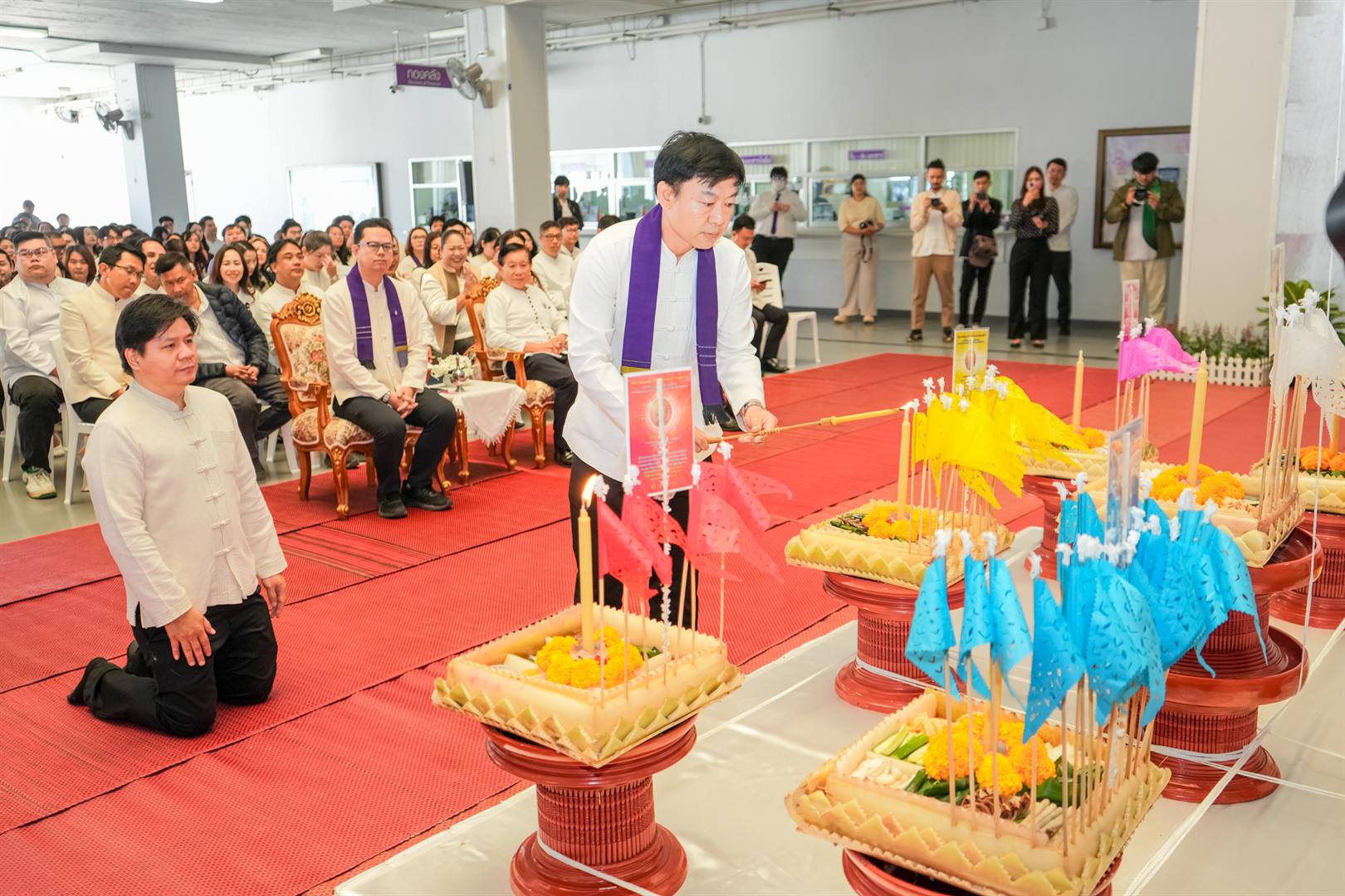 The ceremony was graciously presided over by Associate Professor Dr. Supakorn Pongbangpho, President of the University of Phayao, who officiated the lighting of incense and candles in homage to the Triple Gem and presented ceremonial offerings to the monks. In addition, Associate Professor Dr. Nattapong Damrongwiriyanuphap, Dean of the School of Engineering, was appointed as a representative to perform the ritual of lighting the Nopphakhro (Nine-Planet) offerings for those born on Monday, in accordance with traditional beliefs, to invoke auspiciousness, harmony, and well-being for individuals and the organization.
